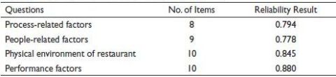 In Table 1, Cronbach’s alpha was used to assess the internal reliability of the four items that are process-related factors, people-related factors, the physical environment of the restaurant and performance factors. Cronbach’s alpha for the overall scale was 0.82, according to the results. The final reliability of the resulting four-item scale was considered acceptable, α = 0.82.