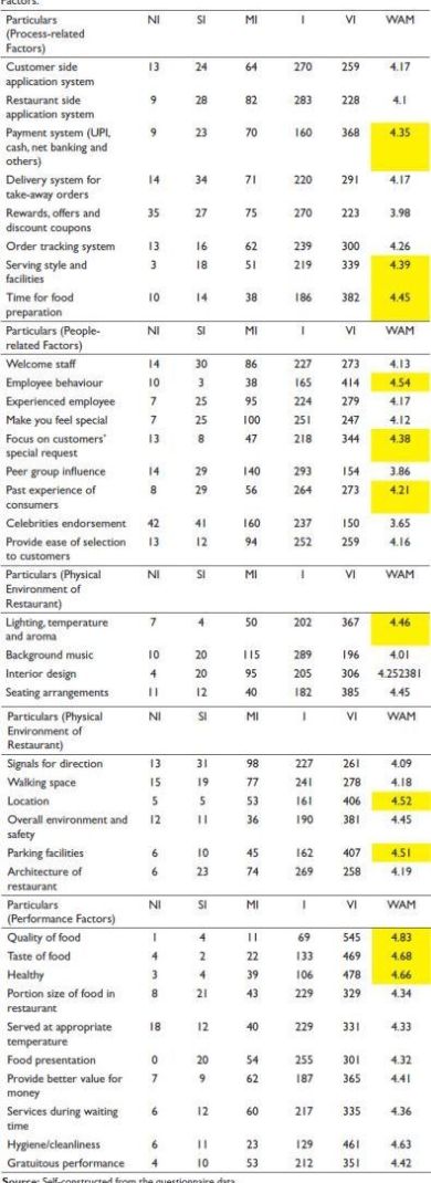 Note: The yellow-shaded cells highlight the service quality factors that received the highest Weighted Average Mean (WAM) within their respective categories. These values represent the most influential or most strongly perceived factors by customers in shaping their restaurant dining experience. By shading these top-scoring items, the table allows readers to quickly identify the dimensions of service quality that customers consider most important whether related to processes, people, physical environment, or performance. Emphasising these top-ranked variables makes it easier to interpret the results and recognise key priority areas for restaurant managers seeking to improve customer satisfaction and overall service quality.