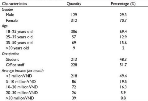 The completed questionnaire was sent to 500 consumers in Hanoi from December 2024 to February 2025. After the data were cleaned, 441 respondents’ data were analysed by SPSS 26 software (Table 1).
