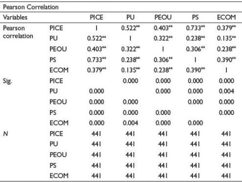 Notes: **Significant at the 0.01 level (two-tailed). ECOM: E-commerce platform factors; PEOU: Perceived ease of use; PICE: Purchase intention on Chinese cross-border e-commerce platforms; PS: Perceived safety; PU: Perceived usefulness.