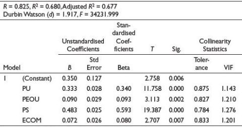 Notes: Dependent Variable: Purchase intention on Chinese cross-border e-commerce platforms (PICE). Predictors: (Constant), Perceived usefulness (PU), Perceived ease of use (PEOU), Perceived safety (PS), E-commerce platform factors (ECOM). VIF: Variance inflation factor.