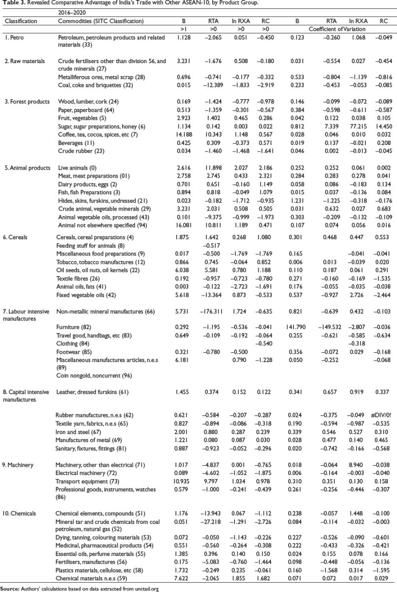 The various RCA indices as presented in the research methodology computed for India’s trade with ASEAN economies for a period 2016–2020, for commodities belonging to 10 categories and 50 products at Standard International Trade Classification-3 (SITC-3), following the Lemer’s Aggregation scheme, from the data extracted from the Unctad database (Table 3) (see Table A2 and Table A3).