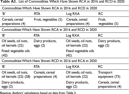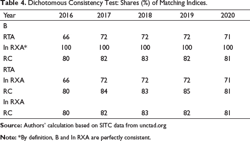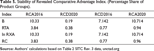 To further understand the stability of the RCA values during the period 2016–2020, the various measures of stability are applied to the results of the RCA indices. The percentages of the products groups were calculated, which have RCA during the year ‘2016’ but seem to have an Revealed Comparative Disadvantage (RCD) during the period ‘2020’. In addition, similarly, the percentages of the product groups that seem to have RCD in the year ‘2016’ but an RCA during the year ‘2020’ (Hoekman & Djankov, 1997). The product groups after analysis present that India had an RCA during the year 2016 but presents an RCD in 2020, such products accounted between 1% and 10% of the total value of the commodity trade during the period 2016 and less than 1% in 2020. Such products, which reveal an opposite situation, that is, an RCD during the year 2016 but an RCA by the year 2020, were comparatively little higher, which makes up between 7 and 10% (see Table 5), presenting not much change in the RCA during the period of the study. The final values of the ‘B’ and In RXA are usually identical as their perfect match that could be obtained under the dichotomous consistency test.