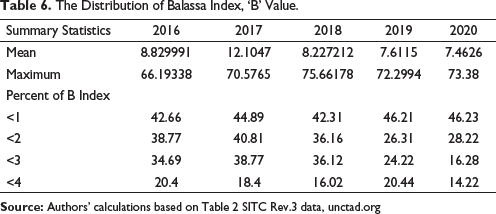 The changes in the distribution of the ‘B’ Balassa values (Table 6) over the period, as suggested by Hinloopen and Marrewijk (2001), reveals India’s RCA has been consistent with the ASEAN economies—the mean value calculated during the period 2016 is 8.829 this had registered at 8.227 during the period 2018 and after that there was a slight decline to 7.46 during the period 2020. The maximum value also gradually increased from 66.19 from the year 2016 to 73.38 by the year 2020. In the year 2016, 42.66% of the ‘B’ values were greater than 1 and this gradually increased to 46.23 during the year 2020, and 38.77% of the ‘B’ registered greater than 2 and this halved to 28.22 during the end of the year 2020. In addition, 34.69 of the ‘B’ values could be found to have value which is greater than 3, this gradually declined to 16.28% in the year 2020. The products with ‘B’ values which were >4 were 20% in the year 2016 and this significantly reduced to 14% by the end of the period of the study. This presents that the distribution of ‘B’ value over the period was largely consistent during the whole period of the study.