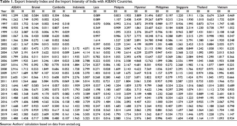 Before making an analysis study on the RCA index to understand the trade potential between the ASEAN economies and India, it would be in the fitness of things to make a careful analysis on the growth of the intensity of trade between the two. According to the ‘natural trading partner theory’ trade between countries who are neighbours and proximity to each other benefit from the FTAs (Krugman & Obstfeld, 2021). Hence, ASEAN countries being closer to India from a distance point of view tend to trade more with their partners. The values of export intensity index (EII) and the III present a greater value of intensity of both export and import relations of India with the ASEAN during the period 1995–2000 (Table 1).