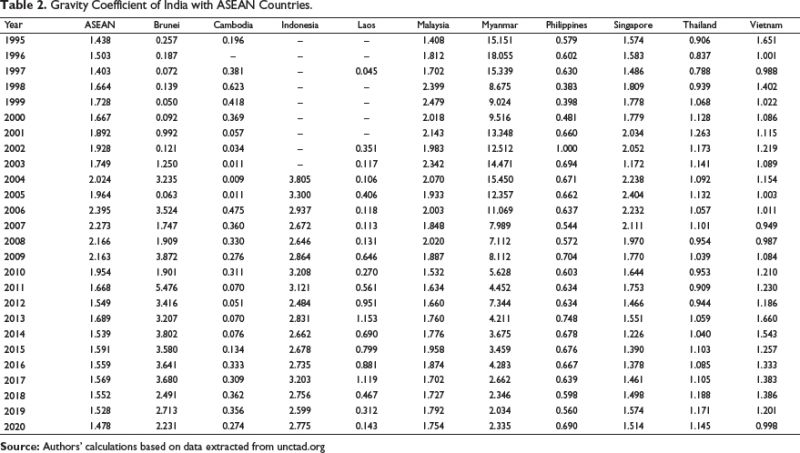 To further understand gravity of trade between India and the ASEAN region, The GC values for the period of 1995–2020 were analysed to observe the trade dependency situation between them. The values of GC (Table 2) present a greater degree of trade gravity between India and the ASEAN nations during the period of study. The GC value for the whole period (1995–2020) presents a greater than one presents a higher trade integration of India with the ASEAN-10 nations. The average GC value for the entire period of India and the ASEAN is at 1.755 presenting higher integration of the trade among them. Among the countries taken for the study, the GC value between India and Myanmar is the highest with a two-digit value registered for total 9 years, these values reconfirm greater trade integration of India and Myanmar and further this potential can be tapped between the two, the average GC value is at 8.429. Indonesia registered the average GC values at 2.899 followed by Brunei where the average for the period 1995–2020 is at 2.063. Thailand and Vietnam also have presented greater gravity of trade integration with India with average GC values higher than one. Among the ASEAN-10, Philippines (0.629 average GC value), Laos (0.419 GC value) and Cambodia (0.239 GC value) have been low.