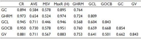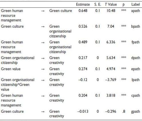 The indirect effect of green HRM on green creativity through green culture was found not significant (estimate = –0.008, p = .77). Hence, we see that green culture is not mediating the relation between green HRM and green creativity. However, the indirect effect of green HRM on green creativity via GOCB is found to be significant (estimate = 0.106*, p < .05) including the direct relationship with GOCB as well. Hence, we understand GOCB is not fully but partially mediating between green HRM and GOCB.
