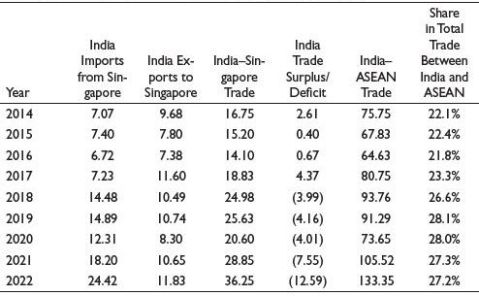 India’s trade with Singapore accounts for a substantial share of its trade with the ASEAN region. Between 2014 and 2017, Indonesia surpassed Singapore as India’s top trading partner in ASEAN. However, from 2018 to 2021, Singapore reclaimed its position as India’s leading partner, with rapid export growth from Singapore to India. Trade data from this period indicate a shift in India’s trade balance with Singapore, moving from a surplus (2014–2017) to a deficit (2018–2022), reflecting changing demand dynamics between the two countries.