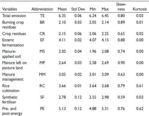 The study has been conducted to explore carbon and carbon equivalent emissions from agri-food systems that are generated by farm production activities and pre- and post-production processes. FAO describes farm-based activities as direct sources of emission, like burning crops, rice cultivation, manure and fertiliser usages, while pre- and post-processes are supply-chain and indirectly sourced, which includes transportation, processing, household consumption, input manufacturing as well as waste. The regression analysis has been done to analyse the proxy variable of carbon emission from both direct and indirect sources at the global level. The data have been collected from the FAO database for the time span of 1990–2020. Table 1 represents the statistical description of the data series.