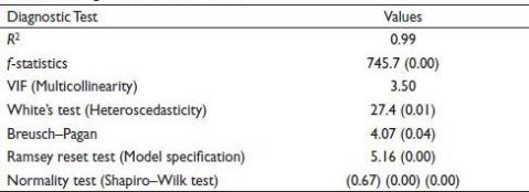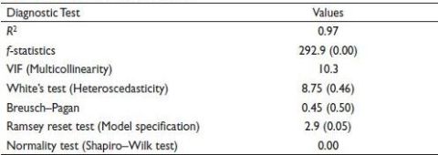 Table 2 represents the correlation matrix of the variables. It specifies that the variables, except rice cultivation, synthetic fertiliser and pre- and post-energy, are highly correlated, as their value is more than 0.5. The association describes the dependency and linear relationship between two variables. Also, some other variables show an adverse relationship, which needs to be checked by model estimation. Therefore, the following model is considered for the study.